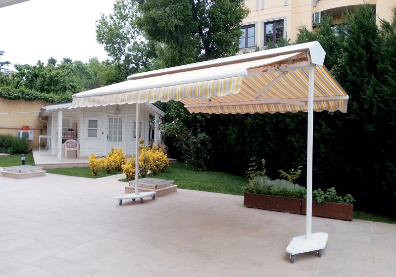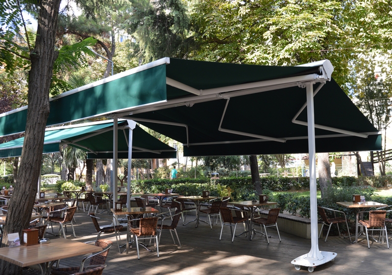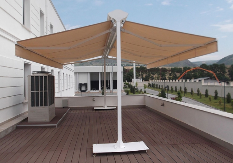 The double-sided awnings are offered as the most suitable solution for users who want to cover large areas with economical ways. Designed with aesthetic lines and touches, the system is particularly suitable for use in large areas. The system can be moved thanks to the wheels added to the metal legs that integrated in the structure.